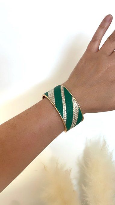 Son design crée un jeu de lumière subtil entre le cuir grainé vert et le cuir texturé effet python or clair.