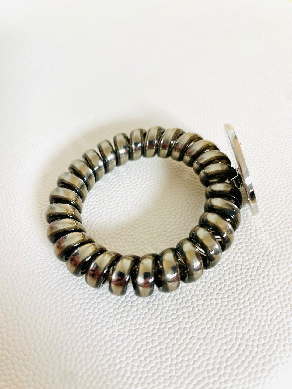 elastique gris brillant en spirale avec cabochon incrusté d'un rond en cuir de 25mm de diamètre